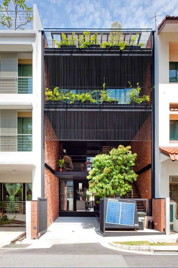 Với kiến trúc hiện đại, mẫu nhà phố 40m2 nổi bật bởi cách trang trí ốp tường bằng gạch màu đỏ, cách thiết kế như vậy khiến căn nhà trở nên năng động và trẻ trung hơn. Mành che mỏng bằng sắt với các khoảng hở thông suốt được lắp đặt ở mặt tiền giúp căn nhà thêm phần hiện đại và sang trọng, tạo cho kết cấu của căn nhà thêm cân bằng và đặc biệt hơn. Gam màu đen nổi bật kết hợp với việc trồng và trang trí câyxanh ở những không gian chết, làm cho mẫu nhà phố trở nên tươi mới và hoàn hảo.
