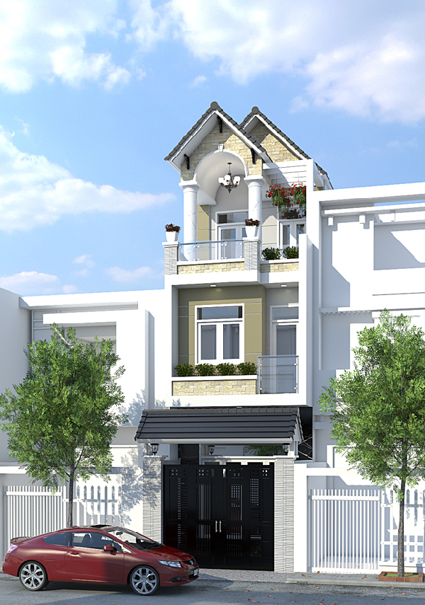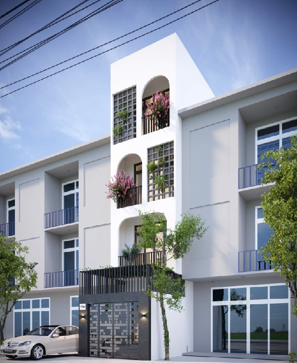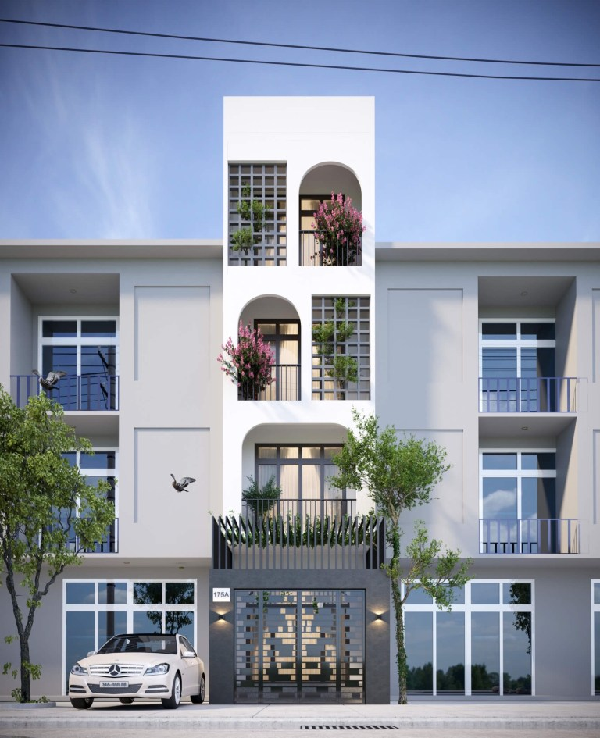 Nếu như chỉ khối liền sơn trắng sẽ mang đến sự nhàm chán, không có điểm nhấn, kiến trúc sư tạo để lại dấu ấn đậm nét thiết kế này bằng cách: Tầng 1 hệ thống cổng rào được ốp đá sẫm màu xung quanh viền kết hợp với lam che nắng được phủ lên bởi cây xanh có đặc tính rủ làm nên một phần gara oto râm mát vào mùa hè. Khu vực mặt tiền tầng 2, 3 và 4 sử dụng mái vòm với đường cong mềm mại mang đến cảm giác kiến trúc châu Âu đặc trưng cho phần mái cầu kỳ đang được áp dụng. Ở khu vực tầng 3 và 4 kết hợp với ô vuông được bố trí để trông thêm cây xanh cho không gian nhà. Thiết kế không cầu kỳ phức tạp nhưng lại mang đến sự sang trọng, hiện đại với cây xanh được bố trí, tạo nên cảm giác thoải mái, dễ chịu cho gia chủ.