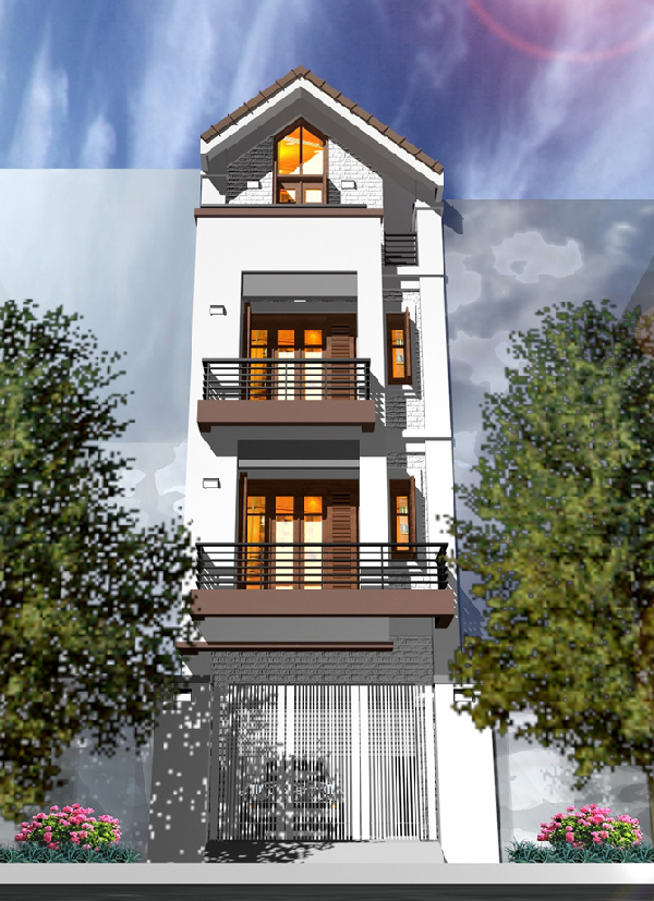 Mẫu nhà phố 4 x 14 theo phong cách tân cổ điển với quy mô 5 tầng kết hợp với gara oto và khu vực tầng thượng được bố trí tum cây xanh sang trọng, cực kỳ thu hút ánh nhìn.