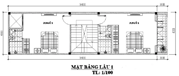 Lên đến lầu 1 bố trí: ban công nhỏ ở mặt tiền, tiếp đến 2 phòng ngủ với 2 nhà vệ sinh bên trong phòng để đảm bảo sự riêng tư cho thành viên sử dụng căn phòng. Khu vực cầu thang được bố trí ở giữa, ngăn cách hai phòng ngủ với nhau.
