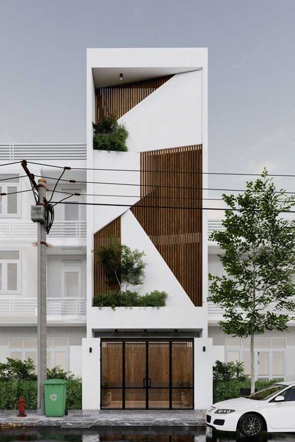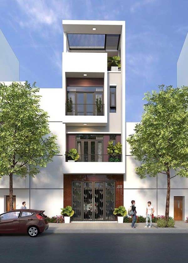 Nhằm mang không gian xanh vào môi trường sống bên trong căn nhà, mẫu nhà phố 4x8 thể hiện được vẻ đẹp hiệnđại và tươi mới trong thời đại số. Mặt tiền với hệ thống cửa cổng và tường được dựng bằng gạch thông gió kết hợp với cây xanh trong nhà tạo nên điểm nhấn cho người nhìn. Các tầng trên được tận dụng tối đa không gian để lắp đặt hệ thống cửa kính rộng, vừa mang được luồn ánh sáng tự nhiên vào trong nhà, lại giúp căn nhà trở nên thông thoáng và rộng rãi hơn. Sân thượng nho nhỏ ở trên cùng được bố trí thêm lam chắn cho chủ hộ có thể thoải mái trồng cây, chăm sóc cây cảnh như một cách giải trí xả stress sau những lo toang bộn bề trong cuộc sống thường nhật. Gam màu trắng nổi bật khiến căn nhà trở nên năng động và trẻ trung hơn. Là mẫu nhà phố đẹp rất được nhiều chủ đầu tư yêu thích.