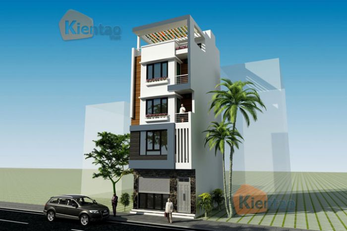 Mẫu nhà phố 5 tầng trên với được thiết kế với mái bằng, mang lại sự hiện đại. Bên cạnh đó, phần mái ban công được thiết kế từ kính cường lực đón ánh sáng tối đa cho khu vườn nhỏ trên tầng thượng, nhưng vẫn đảm bảo được yếu tố an ninh tối đa. Màu sơn chủ đạo của toàn bộ mặt tiền là tông màu sáng quen thuộc, thường bắt gặp trong các mẫu nhà trên các con phố. Chất liệu kính cường lực vẫn được ưu tiên sử dụng trong thiết kế ngoại thất, cụ thể là cửa chính tầng 1 và cửa sổ các tầng. Điểm xuyết thêm vào đó là những khung cửa gỗ nâu bao quanh khu ban công nhỏ xinh khéo léo được bố trí trên không gian ban tầng 2 và tầng thượng. Khuôn khổ của loại hình nhà phố này cũng bớt sự gò bó hơn khi có sự xuất hiện của những chậu xây xanh khéo léo được bố trí tại ban công các tầng.