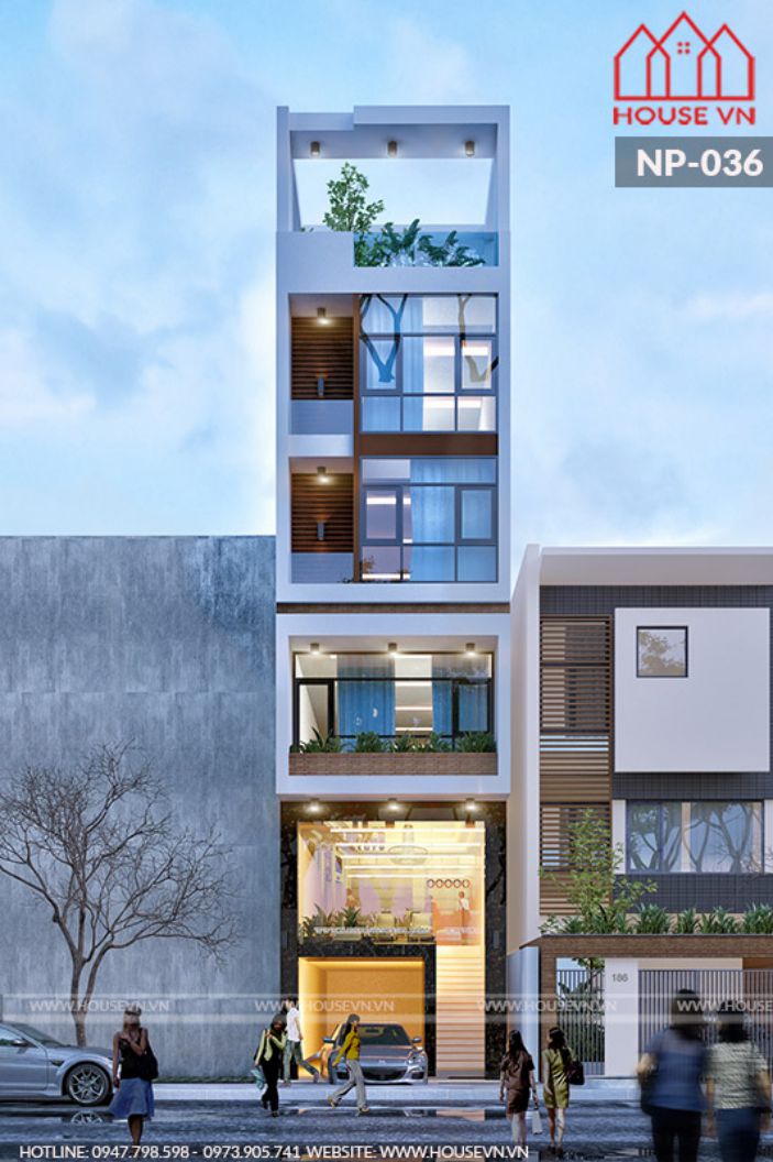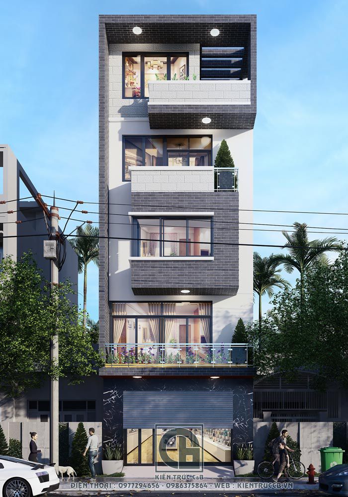 Với những gia chủ yêu thích phong cách thiết kế hiện đại, trẻ trung kết hợp với xu hướng thẩm mỹ kiến trúc hiện nay thì phương án nhà phố 5 tầng này là gợi ý hoàn hảo. Các mảng hình khối kiến trúc ra vào tại mặt tiền sẽ kết hợp cùng với khoảng diện tích trong nhà để tối ưu nhất về tỉ lệ. Qua đó, ngôi nhà như 1 tổng thể kiến trúc có chiều sâu, chắc chắn về hình và có điểm nhấn trong màu sắc.