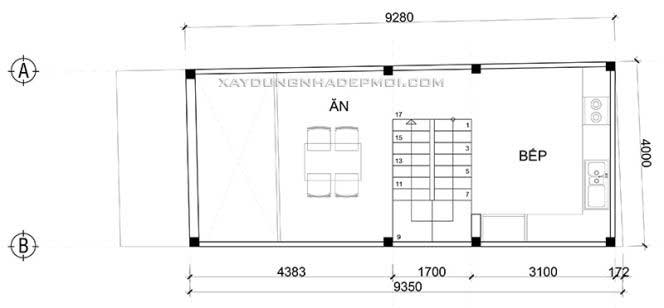 Tầng lửng sẽ được thiết kế bao gồm phòng ăn và phòng bếp nằm đối xứng nhau qua khu vực cầu thang. Vì đây là không gian sinh hoạt chung, đồng thời cũng là nơi cả gia đình cùng quây quần bên nhau thưởng thức những món ngon mỗi ngày, do vậy được ưu tiên xây dựng trên diện tích lớn, chiếm trọn tầng tửng.