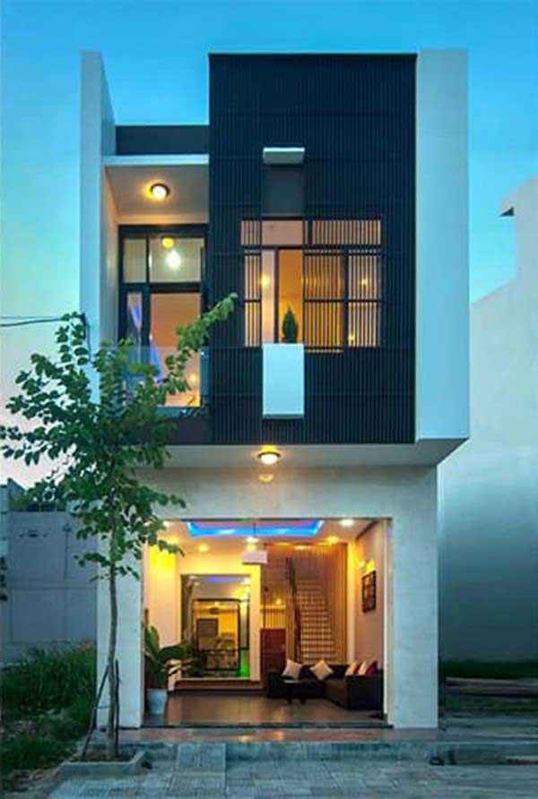 Nổi bật bởi 2 gam màu trắng và đen tương phản, tuy khác biệt nhưng khi kết hợp vào nhau đã tạo nên sự mới mẻ và hiện đại cho căn nhà phố 5x12m. Tầng 1 dược lắp đặt hệ thống cửa kính, mảng tường được ốp đá granit màu vàng nhạt tạo nên sự sang trọng, hiện đại cho căn nhà. Tầng 2 được thiết kế khối ban công đua rộng góp phần tạo nên một không gian mở thông thoáng cho căn nhà. Thiết kế lam chắn được ghép từ các thanh sắt màu đen xếp song song lấp đầy vừa khít nhau tạo nên nét đẹp thẩm mỹ cho căn nhà.
