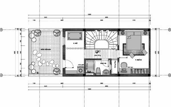 Tầng 3 bao gồm ban công, phòng thờ được thiết kế song song với khu giặt đồ. Ngoài ra phía cuối còn được xây dựng 1 phòng ngủ cho con trai lớn. Nhìn chung, mặt bằng tầng 3 tương đối rộng rãi và thoáng mát. Là thiết kế tối ưu nhất giải quyết được tình trạng diện tích chật hẹp mà vẫn đảm bảo không gian sống cho tất cả thành viên trong gia đình.