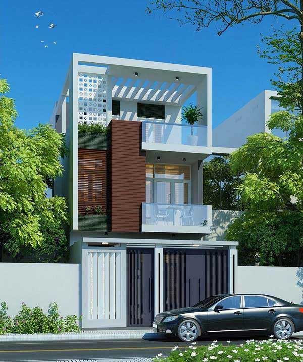 Mẫu nhà phố 5x20m là mẫu nhà ống 2 tầng 1 tum được thiết kế theo phong cách hiện đại và năng động. Gam màu trắng chủ đạo kết hợp cùng hệ thống cửa kính rộng đã góp phần đưa luồn ánh sáng tự nhiên đi vào bên trong căn nhà giúp cho không gian ở bên trong thoáng mát, thoải mái. Tường rào và cổng được thiết kế đơn giản nhưng lại góp phần tạo điểm nhấn cho căn nhà trở nên hiện đại, sang trọng. Bờ tường rộng kết hợp cùng gam màu xám chạy thẳng từ tầng trệt lên tầng 3 khiến cho ngôi nhà trở nên mới mẻ, tạo nét độc đáo riêng mà không thể nào trộn lẫn với bất kì một căn nhà khác.