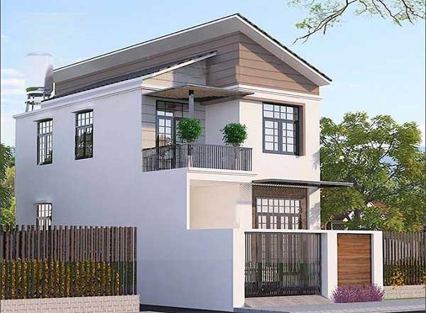 Mẫu tiếp theo là 1 căn thiết kế 2 tầng nổi bật với mái vòm lệch và tông màu trắng làm chủ đạo.Tông nâu nhẹ nhàng được khéo léo lồng xếp vào phần mái cũng như ở cửa chính càng tạo điểm nhấn cho cá tính người sử dụng.Ban công được đặc biệt thiết kế 1 lớp mái che được phủ lên màu đen với chất liệu sơn tĩnh điện giúp không gian trở nên thư thái,sang trọng hơn.Xung quanh nhà được bao bọc bởi hệ thống hàng rào và cây xanh vừa mang lại cảm giác an toàn ,vừa thân thiện,gần gũi với thiên nhiên.