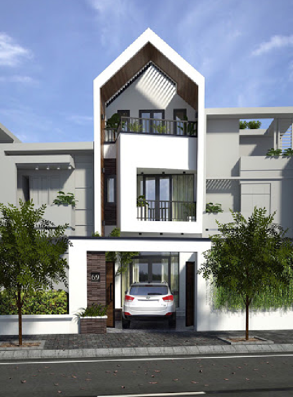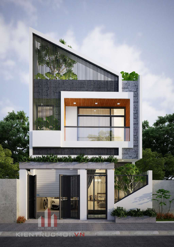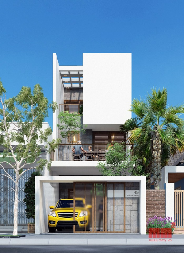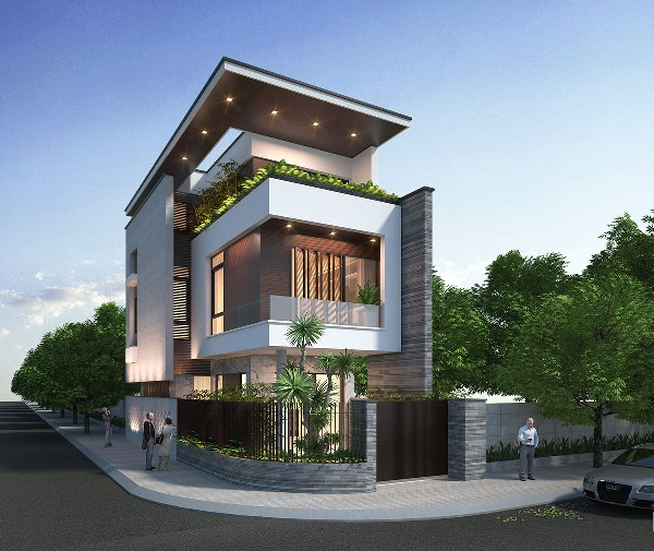 Mẫu thiết kế dành cho ngôi nhà có 2 mặt tiền nên được gia chủ chú trọng, 2 mặt tiền là 2 cách thiết kế khác nhau để mọi vị khách ghé qua đều phải lưu lại trong trí nhớ của mình. Ấn tượng về mặt tiền tầng 2 với ban công được trải dài qua 2 mặt kết hợp với khối hộp vuông vức mạnh mẽ. Tầng 3 không gian xanh phủ tràn với phần trần được sơn giả gỗ ấn tượng. Nhìn tổng thể ngôi nhà này vừa mang vẻ đẹp hiện đại, nhưng ẩn sau đó là vẻ đẹp của sự sang trọng, nét chấm phá của thiên nhiên.