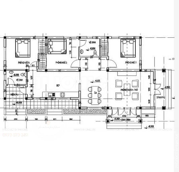 Mặt sàn 7x12m được chia thành hai diện tích song song với nhau. Trước khi bước vào phòng khách sẽ phải đi qua bậc tam cấp, sảnh chính rồi mới đến không gian phòng khách, đối diện phòng khách sẽ là phòng ngủ đầu tiên của gia đình. Tại không gian phòng khách cần rất nhiều ánh sáng cũng như không khí nên bố trí thêm hệ thống cửa 2 cánh và phần sảnh phủ cùng hệ thống bậc tam cấp phía bên. Phòng khách của căn nhà này nối liền với khu vực phòng ăn, đối diện phòng ăn là nhà vệ sinh và khu vực cầu thang. Phòng khách và khu vực bàn ăn được nối thông để tạo ra không gian rộng rãi, thông thoáng cho gia chủ sử dụng. Tiếp theo là khu vực bếp, đối diện là phòng ngủ số 2. Ngay sau phòng ngủ số 2 là phòng ngủ số 3 của gia chủ. Phòng ngủ thứ nhất và thứ hai sẽ có chung nhau là nhà vệ sinh cạnh cầu thang. Từ bếp có lối dẫn ra sân sau nhà, tại đây gia chủ bố trí thêm một nhà vệ sinh thuận tiện kết hợp nơi giặt và phơi đồ.