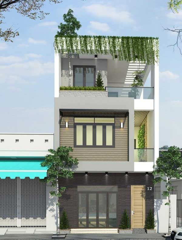 Mẫu thiết kế nhà tiếp theo là 1 thiết kế mẫu nhà phố 7x9m đậm chất hiện đại với tông màu trắng kem sữa làm chủ đạo. Hệ thống mái được xây dựng rất mới mẻ với mái nhà xếp chồng. Phần tường bao ở mặt tiền tầng 2 ngôi nhà không những không tạp sự bí bách mà còn gợi ra 1 không gian rộng rãi, khoáng đạt hơn xong vẫn đảm bảo sự riêng tư cần thiết của chủ nhà. Xung quanh nhà được bài trí rất nhiều cây xanh cho cuộc sống trong lành và thư thái hơn rất nhiều.