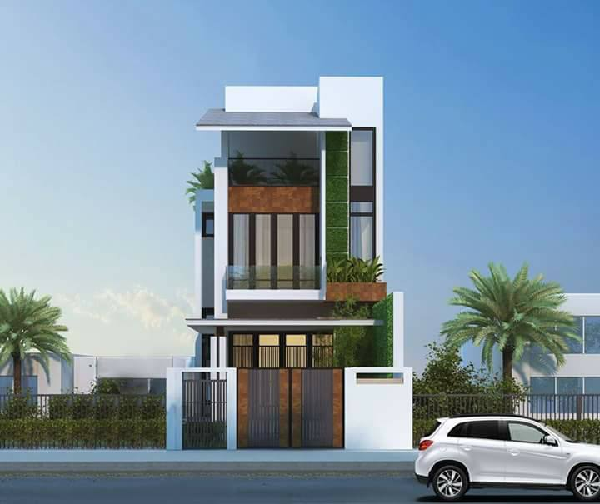Bắt đầu mặt tiền tầng 1 với cửa chính bằng gỗ tự nhiên cực kỳ sang trọng, bên trên sử dụng hệ cửa kính để lấy ánh sáng vào căn nhà. Với cách sử dụng cánh cửa gỗ như vậy gia chủ muốn giữ riêng tư cho không gian bên trong. Phần còn lại là gara oto với hệ thống cửa cuốn sang trọng, bên trên bố trí cửa kính tương tự để lấy ánh sáng vào bên trong, Tầng 2 và 3 của căn nhà này sử dụng kiến trúc khá giôn gs nhau với lớp cửa kính và sơn giả gỗ bề mặt, ban công khá rộng có thể đặt được bàn uống nước. Khu vực tầng thượng để thiết kế tum với cây xanh bao quanh nhà.