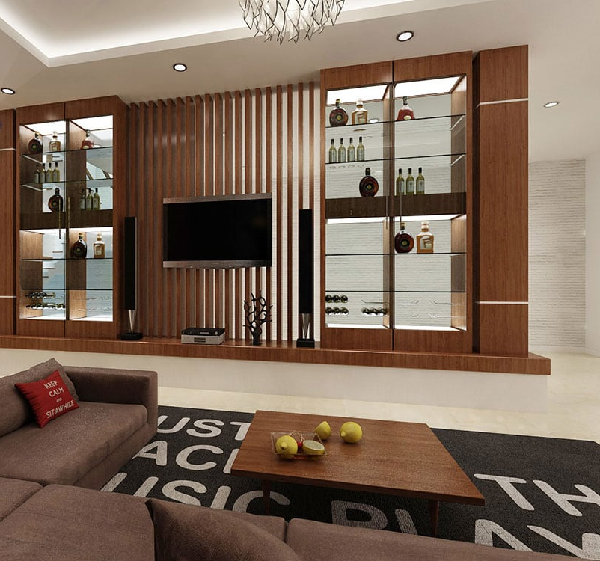 Đối diện sođa chính là tủ kệ ốp gỗ cực sang, tại đây gia chủ bày lên không gian những đồ trang trí hay những chai rượu mà gia chủ đang sở hữu. Sử dụng tivi gắn tường với lớp gỗ ốp phía sau nổi bật. Điểm nhấn là tránh kính gắn tường kết hợp đèn chiếu sáng, thảm đen sang trọng, hiện đại và đèn pha le với thiết kế lạ mắt.