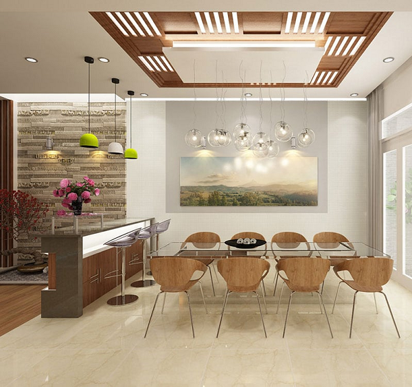 Trong khu vực bếp + ăn của gia đình được bố trí một quầy bar ốp đá, gỗ sang trọng. Bên trên sử dụng 3 chiếc đèn khuyết hiện đại. Sau đó mới đến khu vực bàn ăn với thiết kế đơn giản: chiếc bàn mặt kính dài với 8 chiếc ghế được chia đều hai bên sử dụng chất liệu bằng gỗ và thép trắng hiện đại, gọn ngàng không chiếm quá nhiều diện tích trong căn nhà. Bên trên trần được ốp gỗ kết hợp với đèn tròn thành trùm mang đến bầu không khí ấm áp quây quần của gia đình. Bức tranh phong cảnh với phần tường xám là điểm nhấn cho tổng thể thiết kế.