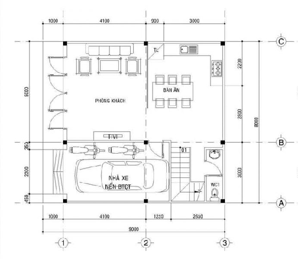 Mặt bằng của ngôi nhà phố 8x9m sẽ được phân chia làm hai diện tích với mỗi bên có chiều ngang tương ứng là 3m và 5m, và không gian bố trí song song để lưu thông không khí, ánh sáng cùng với hệ thống mạng lưới điện nước cũng dễ dàng hơn. Bước vào mặt bằng thiết kế tầng 1 với 1 phòng khách, 1 bếp + ăn, 1 gara oto và 1 nhà vệ sinh.