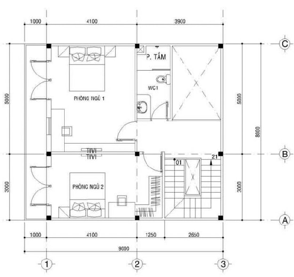 Mặt bằng tầng 2 với 2 phòng ngủ và một nhà vệ sinh chung cho hai phòng tiện nghi, cùng với hệ thống cầu thang thông tầng.