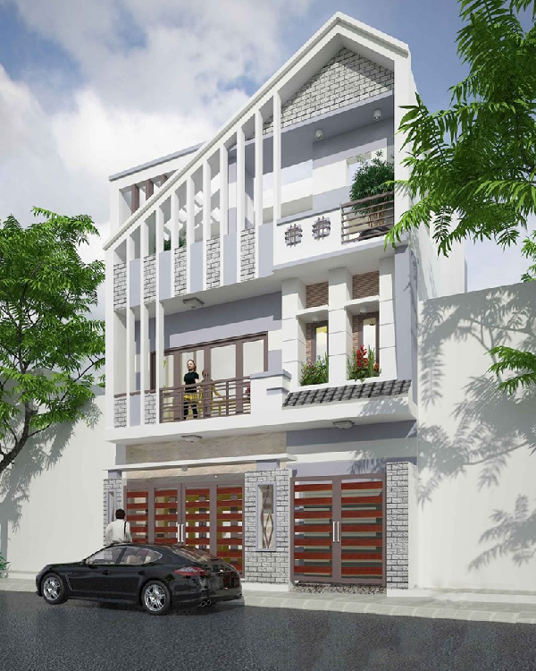 Với kiến trúc tầng tum nhưng mẫu nhà phố 8x9m này vẫn tiếp tục sử dụng kiến trúc đối xứng thường thấy mẫu nhà có phần mặt tiền khá lớn như này. Phần cổng tầng 1 chia làm hai không gian với một bên là hệ cổng sắt sơn đen cùng phần viền trắng, chân cột xám, phần còn lại rào với tường gạch vững chắc, bên ngoài ốp đá. Bên trên hệ thống cổng rào bố trí thêm thanh sắt chắc chắn để đảm bảo an ninh cho toàn bộ ngôi nhà. Tại rào của ngôi nhà bố trí thêm cây xanh để tạo không gian. Đối chiếu lên mặt bằng tầng hai cũng nét kiến trúc tương tự. Tầng 2 có kiến trúc tiến ra phía trước hơn tầng 1 một chút, phần diện tích đó để gia chủ bố trí thành phần ban công sắt sơn tĩnh điện đen nhỏ và lối ra cửa chính. Phần còn lại được bố trí cửa sổ kính tràn với bồn hoa bên ngoài tạo không gian, thêm phần viền nâu nhấn nhá. Cuối cùng là tầng 3 cới ban công bằng sắt nhưng thiết kế đa dạng với màu sắc khác nhau cùng với lam che năng bên trên mang đến khu vực tầng tum khá đẹp mắt.