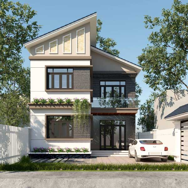 Mẫu nhà phố 9x12m gia chủ hoàn toàn có thể xây dựng theo quy mô xây dựng 3 tầng theo phong cách hiện đại như trên. Mặt tiền tầng một là hệ thống cổng rào vô cùng chắc chắn được sơn trắng khá nổi bật kết hợp hệ thống cây xanh phù hợp. Tầng 2 và 3 là sự kết hợp chất liệu bằng kính hiện đại với điểm nhấn bức tường sơn giả gỗ mang đến cảm giác sang trong cho toàn bộ ngôi nhà. Tại vị trí tầng 3, kiến trúc sư bố trí phần sân thượng rộng rãi, mái che bên trên cùng hệ thống cây cảnh bên dưới mang lại không gian thư giãn tuyệt vời.