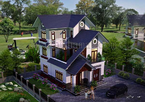 Điểm chú ý của mẫu nhà này nằm ở phần mái. Nếu như mẫu thiết kế sử dụng hệ thống mái giật cấp chỉ với mục đích đơn thuần nhấn mạnh vào sự đồ sộ thì ở mẫu nhà này phần mái kết hợp với không gian tầng hai để làm nên nét kiến trúc đặc biệt. Với phần diện tích mái lớn hơn kiến trúc sư để hở khoảng diện tích để làm nên sân vườn mini ngay trong không gian sinh hoạt của gia đình. Vì thế nhìn tổng thể ngôi nhà được bao bọc bởi hệ thống cây xanh.