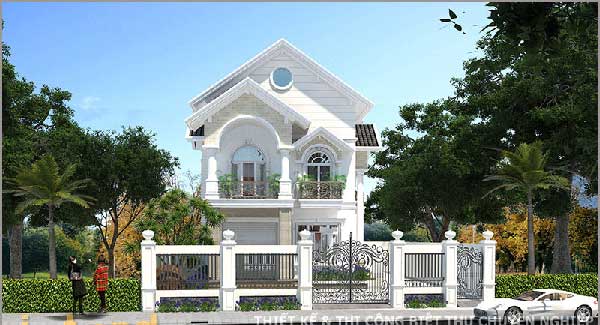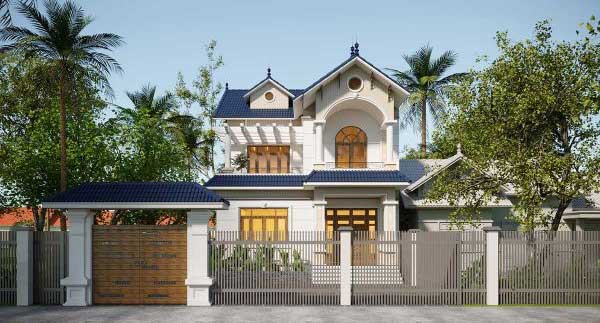 Vẫn là phong cách tân cổ điển cho mẫu nhà phố 9x12m nhưng xây dựng với quy mô 2 tầng nhỏ gọn hơn so với mẫu thiết kế phía trên. Mẫu thiết kế nhà đẹp này biểu chưng cho nét kiến trúc Pháp được áp dụng tại mẫu nhà ở Việt Nam hiện nay. Hệ thống cột trụ được sử dụng linh hoạt từ cột trụ vuông đến cột trụ trong kết hợp hệ thống mái vòm cổ điển. Phần cửa chính cũng linh hoạt khi sử dụng hệ thống cửa mái vòm ở khu vực tầng hai. Điểm đáng chú ý chính là cây xanh được sử dụng từ tầng 1 đến tầng 2 với hệ thống giàn leo và chậu cây liền kề với khung cửa sổ tầng 1. Phần mái ngói xanh dương tiêu biểu cho nét kiến trúc Pháp, hoàn chỉnh nét thẩm mỹ cổ kính cho ngôi nhà.