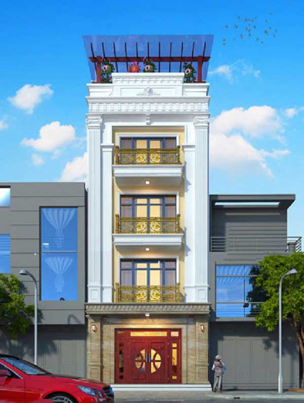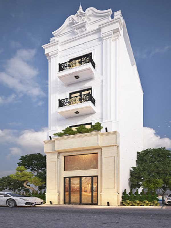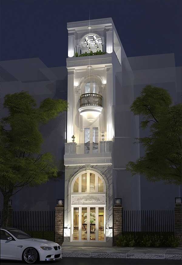 Mẫu nhà phố bán cổ điển 4 tầng dành cho những gia đình có nhiều thế hệ hay đông thành viên, màu trắng chủ đạo với những điểm xuyết thêm đường vân của đá Marble làm cho vẻ bề ngoài của ngôi nhà trở nên quá đỗi sang trọng và quý tộc. Điểm nhấn vẫn là các cột trụ hình khối đơn giản kết hợp với lan can và mái vòm, vừa cổ điển vừa hiện đại giúp cho mặt tiền nổi bật. Hệ thống cửa chính rộng cũng giúp cho căn nhà đón được ánh sáng tự nhiên một cách tối đa.
