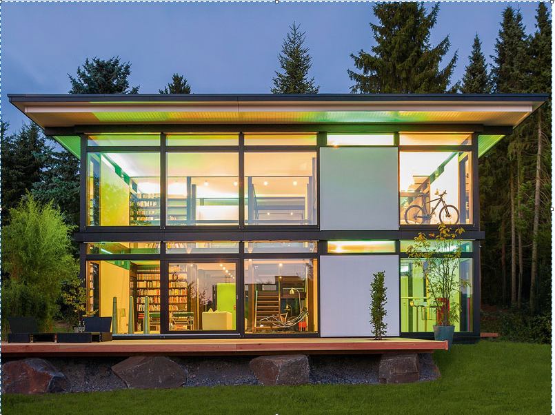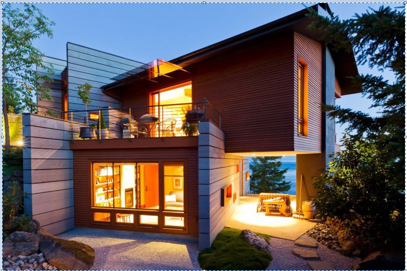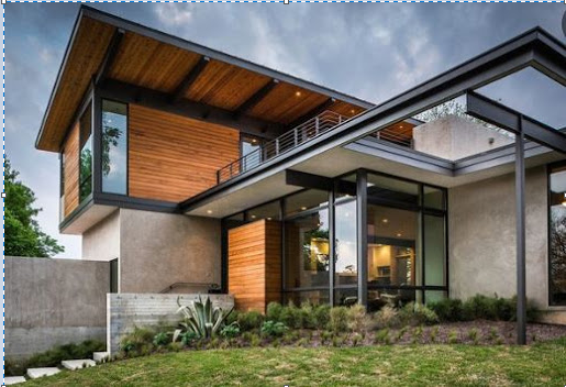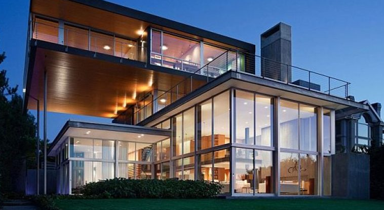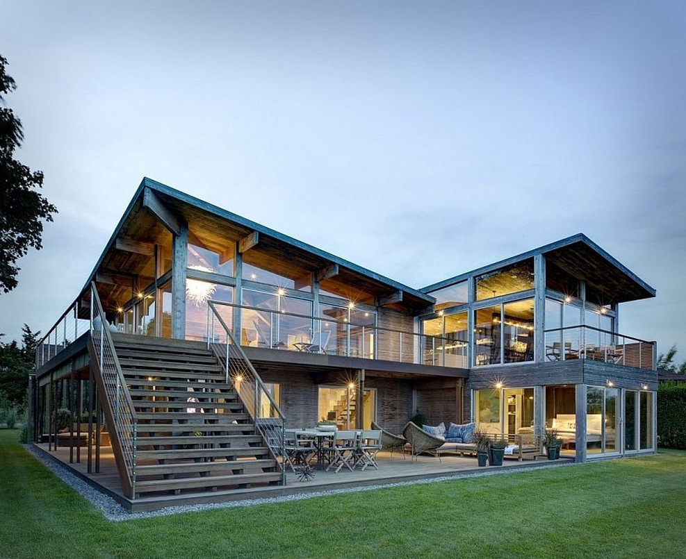 Thêm một mẫu nhà thiết kế khá đơn giản với hình khối lắp ghép và những tấm kính quen thuộc. Điểm nhấn của ngôi nhà là phần mái và phần mặt trước tầng 2 được thiết kế bằng những thanh thép chữ nhật lồng nhau tạo nên nét riêng biệt của ngôi nhà. Xung quanh ngôi nhà đều được lắp những tấm kính trong suốt tiếp nhận được toàn bộ ánh sáng từ thiên nhiên vào ngôi nhà. Ẩn ý của kiến trúc sư khi thiết kế như vậy là để cho gia chủ có thể ngắm cảnh thiên nhiên tuyệt đẹp từ các phía mà vị trí đặt nhà đem lại. Việc sử dụng sàn gỗ và bố trí thảm cỏ trước hiên làm nổi bật lên nét sang trọng thời thượng của ngôi nhà. Đây là một mẫu nhà bạn nên tham khảo nếu bạn yêu thích thiên nhiên, sự đơn giản, thoáng đãng.