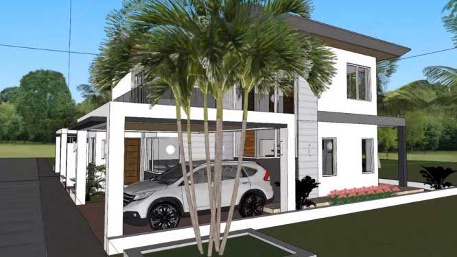 Phối cảnh bản vẽ mẫu nhà vuông 2 tầng mái thái đẹp có 4 phòng ngủ riêng