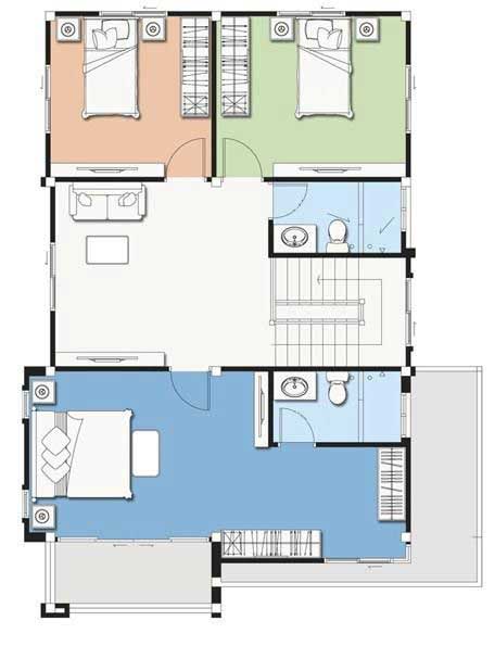 Mặt bằng tầng 2: 3 Phòng ngủ riêng rộng rãi (trong đó 2 phòng cho con và 1 phòng cho bố mẹ), phòng sinh hoạt chung, 2 phòng vệ sinh (1wc chung – 1 wc riêng).