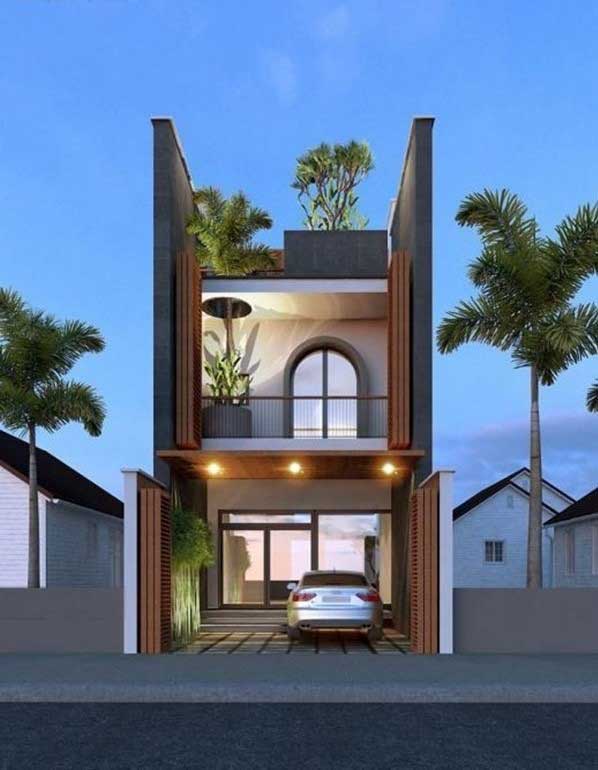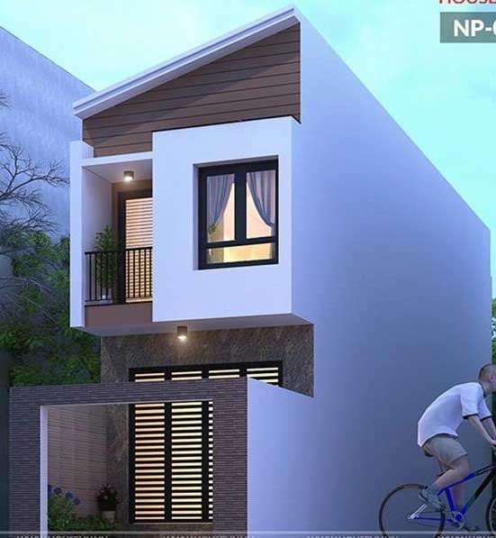 Một ngôi nhà với diện tích mặt tiền từ 4-5 m, thiết kế 2 tầng cùng phần mái ngói nhọn và các cột trụ cao lớn khiến ngôi nhà cao hơn. Sự kết hợp giữa tông màu trắng cùng các màu nâu trầm khiến ngôi nhà ấm áp hơn. Cửa ra vào được thiết kế vừa phải kết hợp thêm 1 cửa sổ nhỏ nên tận dụng tối đa ánh sáng tự nhiên. Phần ban công rộng rãi trên tầng 2 là điểm cộng cho không gian thư giãn của ngôi nhà.