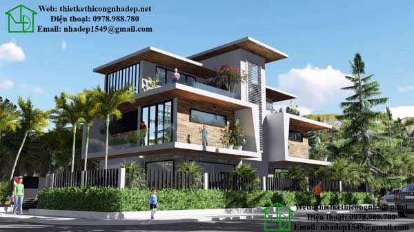 Mẫu biệt thự 3 tầng này có diện tích xây dựng khá lớn quy mô 12x14m do đó chi phí thi công hoàn thiện công trình cũng khá cao. Điểm nhấn của thiết kế này chính là phần mái hình chữ L 2 mái vuông góc nhau và 1 phần mái được làm ban công sân thượng. Thay vì lựa chọn cấu trúc mái thái thì ngôi nhà này tạo phong cách và dấu ấn khác biệt nhờ phần mái bằng và có độ dốc về phía sau sân vườn.