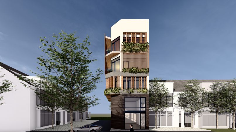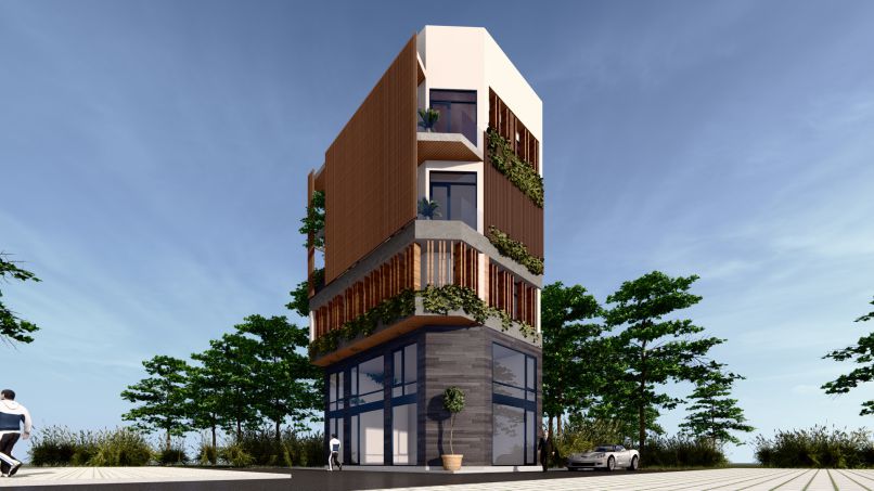 Thông quan hình ảnh phối cảnh mặt tiền từ 3 góc nhìn khác nhau, căn nhà đẹp lộng lẫy với cách biến tấu mới lạ. Kiến trúc mang trong mình tông màu nâu thanh lịch, phóng khoáng...với thiết kế này vừa tiết kiệm được diện tích xây dựng. Kiến trúc sư đã tận dụng nhiều phương án khác nhau để cho ra đời một kiến trúc đi vào lòng người như thế này, kiến trúc theo xu hướng không gian mở giúp cho không gian bên trong phòng được đảm bảo đầy đủ ánh sáng và gió mát nhờ vào hệ cửa kính hiện đại.