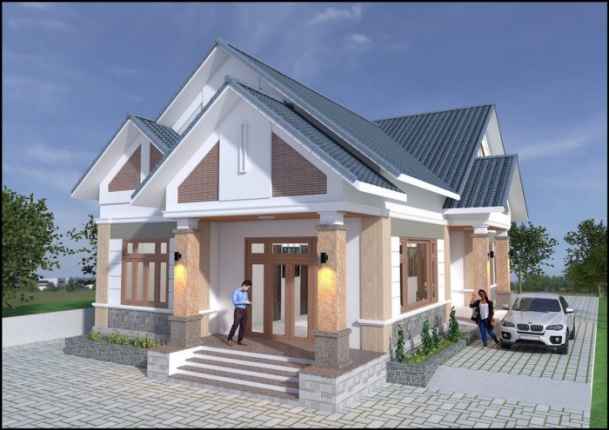 Mẫu thiết kế nhà cấp 4 theo phong cách biệt thự sang trọng chủ đầu tư có gu thẩm mỹ cao và tiềm lực kinh tế cao. Mẫu thiết kế này được xây dựng thành một khuôn viên 12x12m rộng rãi và thoáng mát. Trước nhà là khoảng sân rộng rãi. Ngôi nhà với hệ thống mái thái hình chóp nổi bật bởi màu sắc của mái ngói xanh than. Ngoài không gian chính của ngôi nhà còn có liên kế bên hông phải thiết kế lý tưởng để làm gara giúp ô tô của bạn luôn an toàn trên mọi nẻo đường.