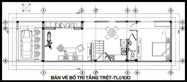 Nó giúp tiết kiệm diện tích của ngôi nhà, nhưng vẫn đầy đủ các tính năng cần thiết. Phòng khách ở sảnh chính. Cầu thang được bố trí công phu giúp ngôi nhà không bị che khuất bởi khu vực sinh hoạt. Tiếp đến là phòng bếp với bàn ăn nhỏ. Cuối nhà có nhà vệ sinh và phòng phơi đồ của gia đình.