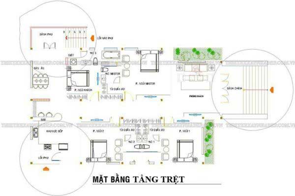 Công năng sử dụng của tầng trệt như sau: phòng khách, phòng thờ, phòng bếp + ăn, 3 phòng ngủ, 1 vệ sinh chung.
