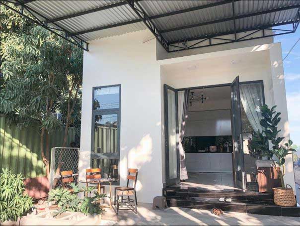 Ba bậc tam cấp dẫn vào phòng tiếp khách, 2 bên là 2 chậu cây nhỏ. Sàn đá granit đen che phủ các vết bẩn và dễ dàng lau chùi. Chân tường được ốp gạch nâu để chống rêu, mốc. Cửa chính và cửa sổ được làm bằng khung nhôm đen và kính cường lực. Về phần hệ thống mái thái, mẫu nhà cấp 4 được trang bị mái bằng và bên trên là khung sắt lợp ngói đơn giản. Trong công trình thiết kế nhà đẹp tuyệt vời này, kiến trúc sư sử dụng mái tôn lạnh màu xanh sáng với các đợt vuông. Điều này sẽ làm giảm khả năng hấp thụ nhiệt, giúp không gian bên trong luôn thoáng mát. Màu sắc ngoại thất trên được làm nổi bật trên nền tường trắng chủ đạo. Cửa chớp là mái bằng để ngăn nước mưa tạt vào cửa. Ngôi nhà cấp 4 mái tôn với kiến trúc đơn giản, không hoa lá, không hoa văn trang trí; Nhưng vẫn mang một vẻ đẹp giản dị. Tái hiện cuộc sống yên bình nơi thôn quê xanh mát.
