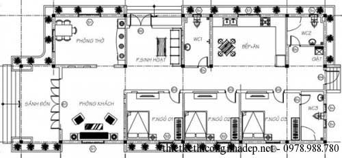 Sự kết hợp khéo léo giữa phòng khách và khu phòng ăn, không gian phòng rất rộng rãi và sạch sẽ sang trọng với nhiều ô cửa sổ thoáng và hai lối đi lớn giúp mọi người dễ dàng sinh hoạt. Khu phòng thờ ở phía bên trong được bố trí bộ bàn thờ lớn là nơi thờ cúng tổ tiên của mọi thành viên trong gia đình.