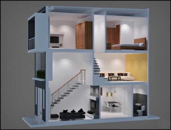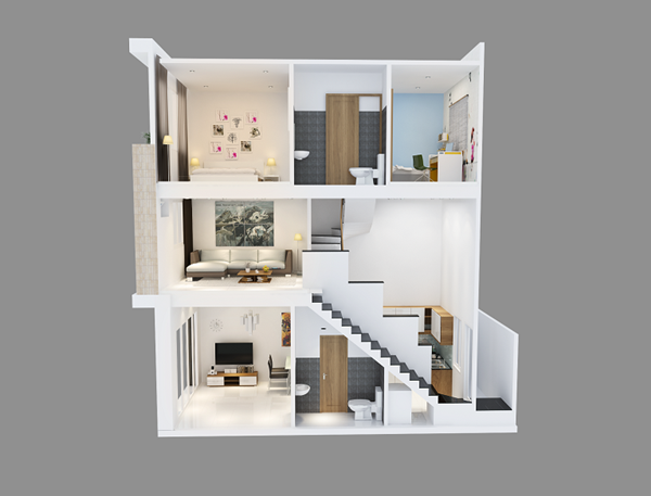 Thiết kế nhà này cũng tương tự như căn nhà trên. Điểm khác biệt là về cách phối màu và lựa chọn nội thất. Nếu như căn nhà bên trên sử dụng tone màu gỗ rất nhiều thì căn nhà này lại đơn giản hơn khi lựa chọn màu sơn trắng và đá lát hoa ở sàn và cầu thang. Với cách này, ngôi nhà này sẽ tiết kiệm được 1 khoản chi phí hơn là với thiết kế bên trên.