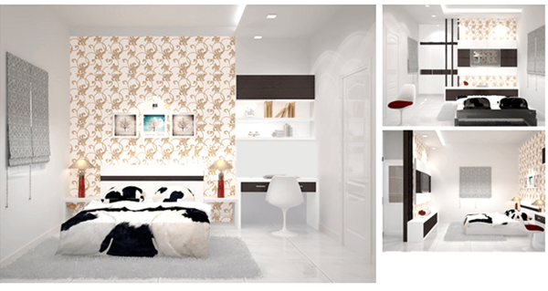 Nội thất bên trong tầng lầu và phòng khách mẫu thiết kế này cũng sử dụng nhiều các hoạt tiết hoa văn nhỏ tạo cho ngôi nhà một tổng thể hài hòa với nhau. Để tạo điểm nhấn cho ngôi nhà, kiến trúc sư khéo léo tạo những mảng màu đen từ nội thất như tủ, ghế sofa, chăn,… thay vì phải sơn tường màu đen.