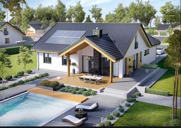 Nếu bạn có quỹ đất dư giả hơn nữa thì đây là gợi ý thiết kế nhà một tầng chuẩn chỉnh mang lại không gian sống thoải mái và đầy đủ tiện nghi. Thiết kế nhà ở và hồ bơi được đặt ở vị trí trung tâm, bao quanh là sân cỏ tự nhiên xanh mát. Căn nhà sử dụng tone trắng-ghi xám sang trọng với hai hiên lớn hướng ra bể bơi đón nắng và hướng ra vườn. Thiết kế mái thái tích hợp với pin năng lượng mặt trời là giải pháp làm mát tự nhiên và tiết kiệm điện năng. Đây chắc chắn là thiết kế nhà ở mơ ước của nhiều gia đình.