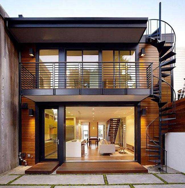 Một thiết kế nhà phố 2 tầng giản dị nhưng quá đỗi độc đáo, sử dụng tone màu nâu gỗ-đen trầm ấm, sang trọng với điểm nhấn là cầu thang được thiết kế cả bên trong và bên ngoài vừa tạo sự tiện lợi khi di chuyển, vừa làm nên nét riêng biệt. Mẫu thiết kế này không thiết kế mái vòm tạo không gian giải trí trên tầng thượng, ánh sáng tự nhiên cũng được tận dụng tối đa tạo không gian thoải mái, gần gũi.