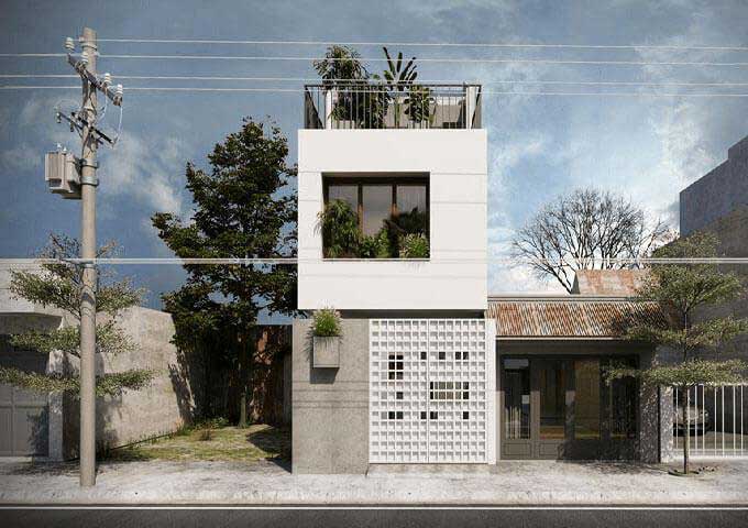 Ấn tượng đầu tiên khi nhìn mẫu thiết kế này là hình dung về một ngôi nhà được lắp ghép bởi nhiều khối hình học xếp chồng lên nhau. Vẫn với phong cách thiết kế đơn giản, hiện đại đang thịnh hành thì đây chắc chắn sẽ lại là một mẫu thiết kế được nhiều người lựa chọn và ưa chuộng. Với khí hậu nhiệt đới và đặc trưng của kiểu thời tiết nắng nóng kéo dài của miền Bắc thì đây là một lựa chọn thiết kế vô cùng hợp lý để cách nhiệt và tiết kiệm điện năng sử dụng.