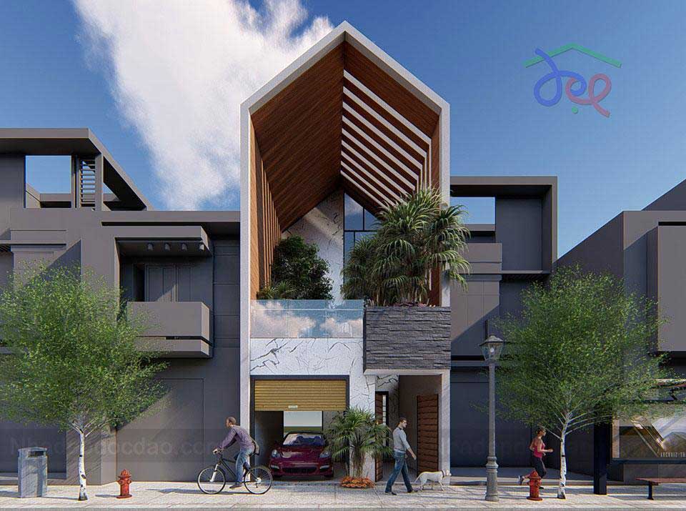 Thiết kế nhà phố 2 tầng tiện nghi khi sử dụng cổng gỗ tự động, bản thân thiết kế của căn nhà cũng hết sức độc đáo khi mở rộng hơn ở tầng trên với thiết kế hình khối độc đáo. Cây xanh cũng được sử dụng với mục đích trang trí và làm mát không gian của tầng thượng và hiên nhà. Vách ngăn an toàn cũng được sử dụng chất liệu kính để nhấn vào nét trang nhã, tinh tế của can nhà.