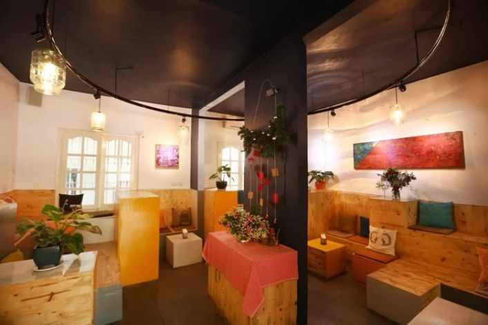 Hệ thống trần nhà được đan xen từ các thanh gỗ Pallet hết sức tinh tế mà chỉ có sự tính toán kĩ lưỡng mới tạo nên được không gian quán đẹp như thế. Hệ thống chiếu sáng với gam màu vàng giúp đánh bật lên màu gỗ mà còn tạo nên sự quen thuộc gần gũi trong hình thức trang trí.