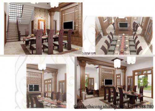 Là không gian được gia chủ đặc biệt chú trọng, do vậy phòng ăn sẽ được thiết kế sao cho hợp phong thủy, phù hợp với yêu cầu của khách hàng nhưng vẫn toát lên được vẻ sang trọng, đặc sắc. Chất liệu gỗ hầu như được sử dụng xuyên suốt trong ngôi nhà, kết hợp hài hòa với tone màu nền đẳng cấp góp phần tạo dựng không gian ấn tượng, bắt mắt. Các nội thất được bố trí hợp lý với điểm nhấn là bộ bàn ăn đẹp nằm ngay trung tâm.
