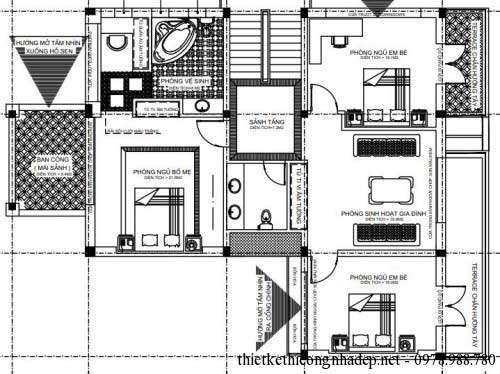 Mặt bằng tầng 2 sẽ bao gồm 3 phòng ngủ và 1 phòng sinh hoạt chung cho cả gia đình. 1 phòng vệ sinh riêng sẽ được bố trí trong phòng ngủ của bố mẹ, 2 phòng ngủ dành cho con cái còn lại sẽ dùng chung một phòng vệ sinh riêng.