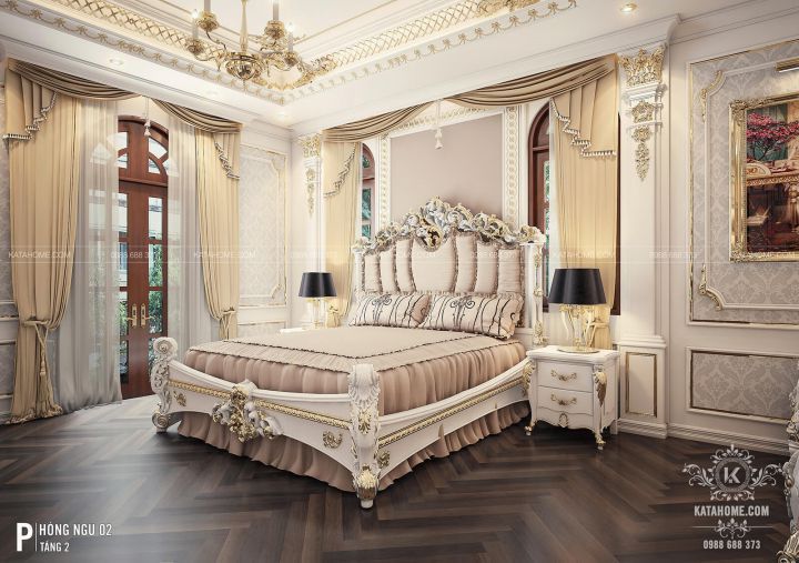 Chiếc giường chuẩn cổ điển cùng với gam trải giường, gối và rèm cửa cùng tone màu với tường tạo nên sự hài hào, ăn nhập và thống nhất trong không gian tạo nên sự nguy nga, tráng lệ.