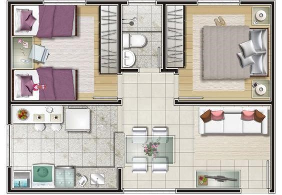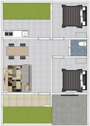 Nếu như số lượng với 1 phòng ngủ không đáp ứng được không gian sinh hoạt từ 3-4 người thì bản vẽ thiết kế này sẽ khắc phục nhưng hạn chế đó. Bản vẽ thể hiện đầy đủ các chức năng sinh hoạt và có cho mình với : 2 phòng ngủ, 1 nhà vệ sinh nằm về phía bên trái ngôi nhà và gian còn lại sẽ tích hợp các không gian như nhà bếp, phòng khách được ngăn cách với nhau bằng một bàn ăn nằm ngay chính giữa.