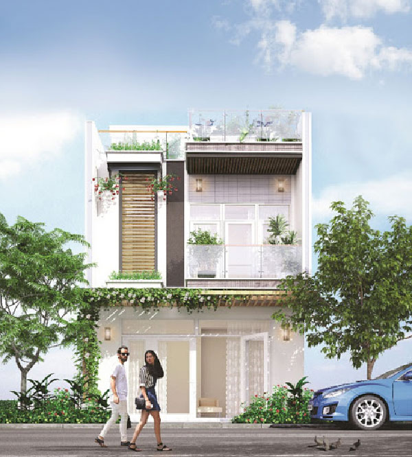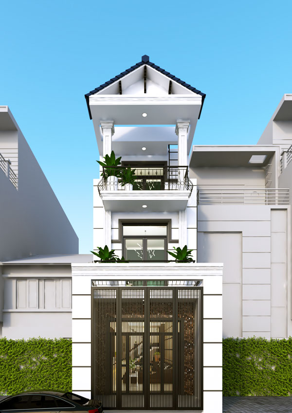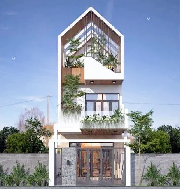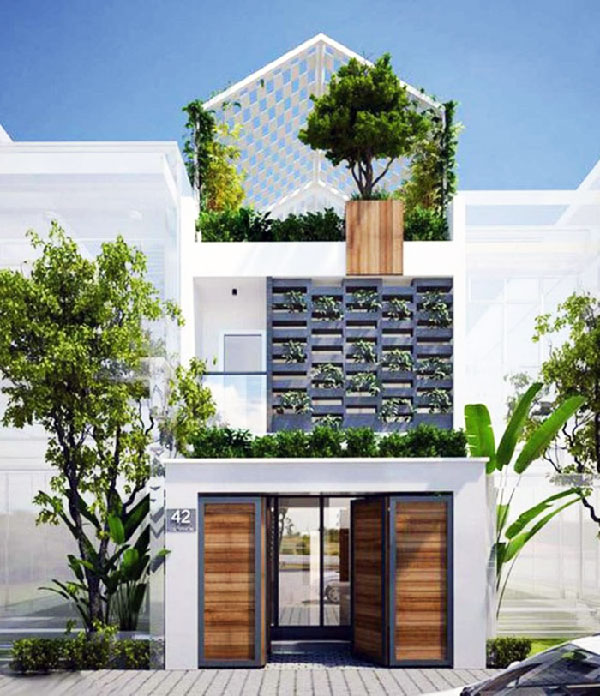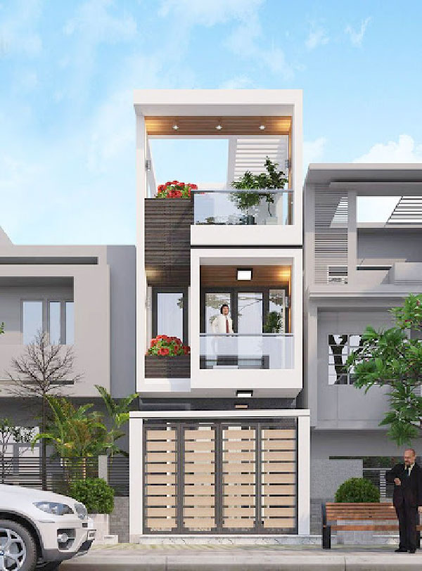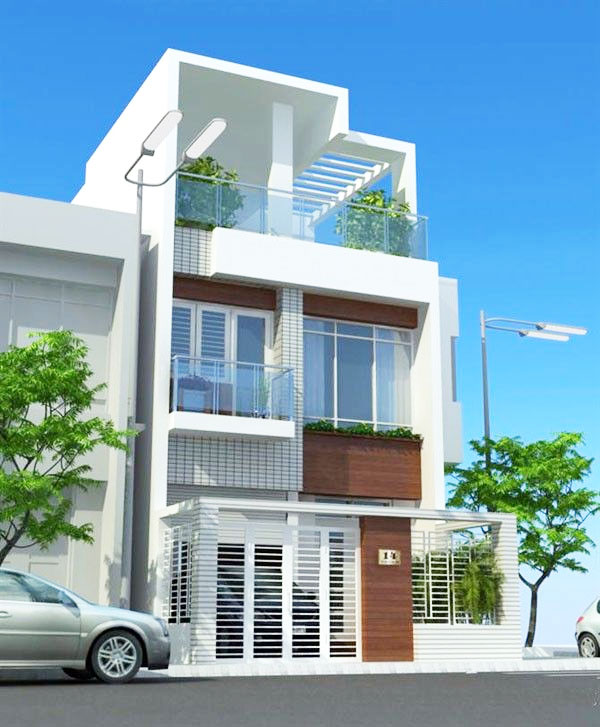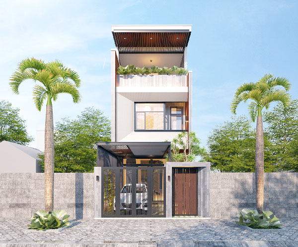 Theo đuổi phong cách hiện đại với ngôi nhà 1 trệt 1 lầu 1 tum, kiến trúc này áp dụng cho căn nhà mặt tiền rộng hơn, từ 6m đổ lên. Căn nhà này ấn tượng bởi hệ thống thanh lam được nối dài từ tầng 3 xuống đến tầng 2. Không chỉ có tác dụng tránh nóng, những thanh lam nay mang đến hiệu quả về mặt thẩm mỹ khi mang đến những đường nét khỏe khoắn cho ngôi nhà, phá đi sự quen thuộc của những ngôi nhà có mặt tiền liền kề hiện nay.