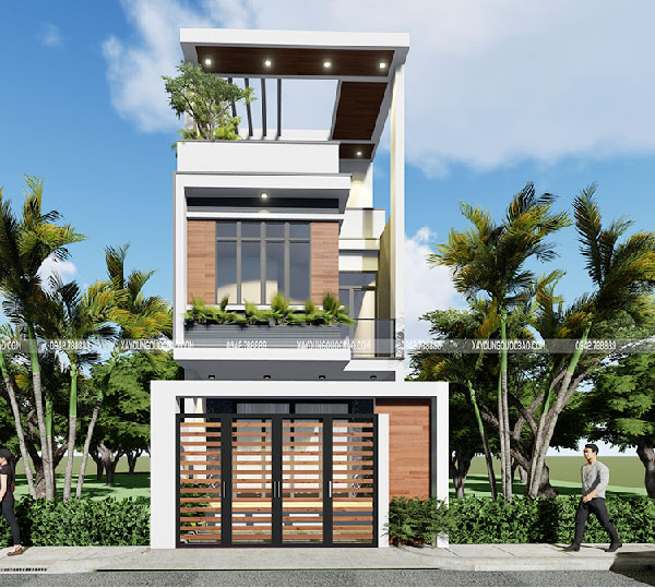 Phong cách thiết kế hiện đại hiện diện trong mẫu thiết kế này từ tone màu chủ đạo trắng, sáng ở mặt tiền kết hợp cùng hệ thống hình khối hình chữ nhật đan xen hợp lý giữa các tầng với nhau. Điểm nhấn căn nhà nằm ở khu vực được sơn sẫm màu giả gỗ tạo nên chiều sâu không gian cho căn nhà, mang đến cảm giác ấm áp, sang trọng. Buổi tối, hệ thống đèn chiếu sáng lắp đặt để tạo chiều sâu ở khu vực này giúp tạo cảm giác về không gian rộng cho mặt tiền của ngôi nhà.