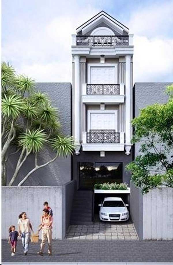 Mẫu thiết kế đầu tiên là ngôi nhà 3 tầng với mặt tiền nhỏ hẹp trong khu phố. Đối với mỗi gia đình xây dựng nhà tầng thì có lẽ 3 tầng là lựa chọn hợp lý nhất vì khiến cho ngôi nhà cân đối hơn nhưng vẫn đảm bảo nhu cầu sử dụng. Ngôi nhà được thiết kế đơn giản, họa tiết không cầu kì, không rối mắt nên ngôi nhà có cảm giác rộng rãi hơn. Các tầng đều được thiết kế ban công và cửa kính nên đảm bảo ánh sáng cho ngôi nhà, phần cửa ra vào với màu đen huyền bí nên trông lịch sự và sang trọng hơn.